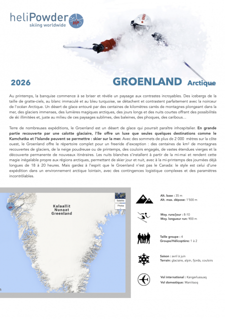 Un désert de glace entouré par des centaines de kilomètres carrés de montagnes plongeant dans la mer, des glaciers immenses, des lumières magiques arctiques, des jours longs et des nuits courtes offrant des possibilités de ski illimitées et, juste au milieu de ces paysages sublimes, des baleines, des phoques, des caribous… Terre de nombreuses expéditions, le Groenland est un désert de glace qui pourrait paraître inhospitalier. En grande partie recouverte par une calotte glaciaire, l'île offre un luxe que seules quelques destinations comme le Kamchatka et l’Islande peuvent se permettre : skier sur la mer. Avec des sommets de plus de 2 000 mètres sur la côte ouest, le Groenland offre le répertoire complet pour un freeride d’exception : des centaines de km2 de montagnes recouvertes de glaciers, de la neige poudreuse ou de printemps, des couloirs engagés, de vastes étendues vierges et la découverte permanente de nouveaux itinéraires. Les nuits blanches s’installent à partir de la mi-mai et rendent cette magie inégalable propre aux régions arctiques. Mais gardez à l’esprit que le Groenland n’est pas le Canada: le style est celui d’une expédition dans un environnement arctique lointain, avec des contingences logistique complexes et des paramètres incontrôlables. HELISKI GROENLAND