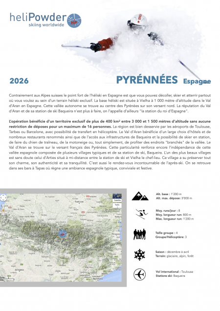 Contrairement aux Alpes suisses le point fort de l'héliski en Espagne est que vous pouvez décoller, skier et atterrir partout où vous voulez au sein d’un terrain héliski exclusif. La base héliski est située à Vielha à 1 000 mètre d’altitude dans le Val d’Aran en Espagne. L’opération bénéficie d’un territoire exclusif de plus de 400 km2 entre 3 000 et 1 500 mètres d’altitude sans aucune restriction de déposes pour un maximum de 16 personnes. La région est bien desservie par les aéroports de Toulouse, Tarbes ou Barcelone, avec possibilité de transfert en hélicoptère. HELISKI PYRENEES