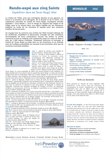 La chaîne de l’Altaï, avec ses montagnes élevées et ses glaciers, se trouve à la jonction de la Mongolie, de la Russie et de la Chine. Les majestueux sommets du massif de Tavan Bogd, montagnes sacrées appelées « Cinq Saints », sont le refuge du léopard des neiges et de l’aigle royal et se situent dans une région habitée par les chasseurs Kazakhs au mode de vie ancestral et réputés pour leur ancienne tradition de fauconnerie. Ce voyage hors du commun aux confins de l’Altaï mongol mélange ski de randonnée, expédition et découverte. Chargés sur des chameaux accompagnés de leurs conducteurs Touvas, les tentes, la yourte commune et tout le matériel sont acheminés jusqu’au camp de base à près de 3 000 mètres d’altitude. Totalement méconnu et sauvage, le massif de Tavan Bogd se prête bien au ski d’aventure et au freeride avec de multiples possibilités de versants et de traversées ainsi que de nombreux sommets skiables.