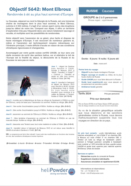 Le Caucase, séparant au nord la Géorgie de la Russie, est une immense chaîne de montagnes dont le plus haut sommet, le Mt Elbrouz, culmine à 5 642 mètres. Il s'agit d'un volcan ayant connu des éruptions jusqu'au début de notre ère. Comparé aux Alpes, il offre un territoire d’exploration très peu fréquenté dans une nature totalement sauvage et reculée, et multiples sont les possibilités de randonnées. Notre objectif sera l’ascension de ce géant, plus haute montagne d’Europe. Il est recouvert de nombreux glaciers et, même si l'ascension est techniquement facile et dispose de moyens mécaniques sur l'itinéraire principal, il reste difficile d'accès en raison de ses conditions climatiques rigoureuses et changeantes.