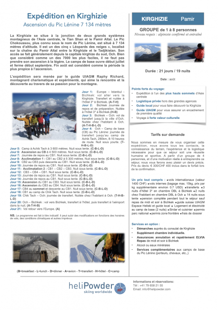 La Kirghizie se situe à la jonction de deux grands systèmes montagneux de l'Asie centrale, le Tian Shan et le Pamir Altaï. Le Pic Chokoussou, plus connu sous le nom de Pic Lénine, est situé à 7 134 mètres d’altitude. Il est l'un des cinq « Léopards des neiges », localisé sur la chaîne du Pamir Altaï entre la Kirghizie et le Tadjikistan. Son accès se fait généralement depuis la capitale kirghize du sud, Och. Bien que considéré comme l'un des 7000 les plus faciles, il ne faut pas prendre son ascension à la légère. Le camps de base ouvre début juillet et ferme début septembre. Fin août est considéré comme la période la plus propice à l’ascension. L’expédition sera menée par le guide UIAGM Raphy Richard, montagnard charismatique et expérimenté, qui aime la rencontre et la découverte au travers de sa passion pour la montagne.