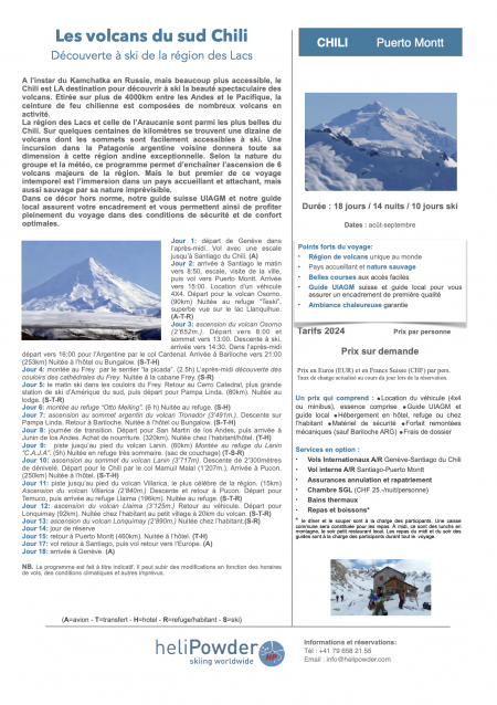 A l’instar du Kamchatka en Russie, mais beaucoup plus accessible, le Chili est LA destination pour découvrir à ski la beauté spectaculaire des volcans. Etirée sur plus de 4000km entre les Andes et le Pacifique, la ceinture de feu chilienne est composées de nombreux volcans en activité. La région des Lacs et celle de l’Araucanie sont parmi les plus belles du Chili. Sur quelques centaines de kilomètres se trouvent une dizaine de volcans dont les sommets sont facilement accessibles à ski. Une incursion dans la Patagonie argentine voisine donnera toute sa dimension à cette région andine exceptionnelle. Selon la nature du groupe et la météo, ce programme permet d’enchaîner l’ascension de 6 volcans majeurs de la région. Dans ce décor hors norme, notre guide suisse UIAGM et notre guide local assurent votre encadrement et vous permettent ainsi de profiter pleinement du voyage dans des conditions de sécurité et de confort optimales.