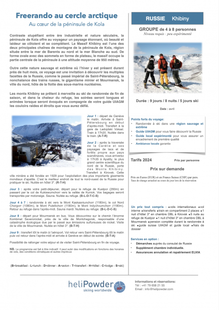 Contraste stupéfiant entre ère industrielle et nature séculaire, la péninsule de Kola offre au voyageur un paysage étonnant, où beauté et laideur se côtoient et se complètent. Le Massif Khibiny est l’une des deux principales chaînes de montagne de la péninsule de Kola, région située entre la mer de Barents au nord et la mer Blanche au sud. De forme ovale avec des sommets en forme de plateau, le massif occupe la partie centrale de la péninsule à une altitude moyenne de 950 mètres. Outre cette nature sauvage et extrême où l’hiver y est présent durant près de 8 mois, ce voyage est une invitation à découvrir les multiples facettes de la Russie, comme le passé impérial de Saint-Pétersbourg, la nonchalance des trains russes, le gigantisme minier et Mourmansk, la ville du nord, hôte de la flotte des sous-marins nucléaires. Les monts Khibiny se prêtent à merveille au ski de randonnée de fin de saison, et dans la chaleur du refuge, les soirées seront longues et animées lorsque seront évoqués en compagnie de votre guide suisse UIAGM les couloirs raides et étroits que vous aurez défié.