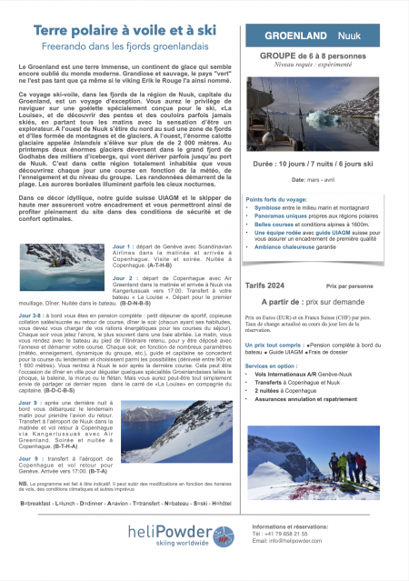 Le Groenland est une terre immense, un continent de glace qui semble encore oublié du monde moderne. Ce voyage dans les fjords de la région de Nuuk est un voyage d’exception. Vous aurez le privilège de naviguer sur une goélette spécialement conçue pour le ski et de découvrir des pentes et des couloirs parfois jamais skiés, en partant tous les matins avec la sensation d’être un explorateur. A l’ouest de Nuuk s’étire du nord au sud une zone de fjords et d’îles formée de montagnes et de glaciers. C’est dans cette région totalement inhabitée que vous découvrirez chaque jour une course en fonction de la météo, de l’enneigement et du niveau du groupe. Les randonnées démarrent de la plage. Les aurores boréales illuminent parfois les cieux nocturnes. Dans ce décor idyllique, notre guide suisse UIAGM et le skipper de haute mer assureront votre encadrement et vous permettront ainsi de profiter pleinement du site dans des conditions de sécurité et de confort optimales.