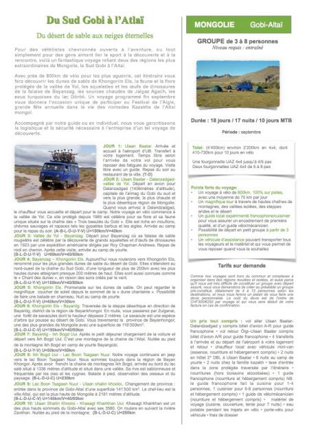 Pour des vététistes chevronnés ouverts à l’aventure, ou tout simplement pour des gens aimant lier le sport à la découverte et à la rencontre, voilà un fantastique voyage reliant deux des régions les plus extraordinaires de Mongolie, le Sud Gobi à l’Altaï. Avec près de 800km de vélo pour les plus aguerris, cet itinéraire vous fera découvrir les dunes de sable de Khongoriin Els, la faune et la flore protégée de la vallée de Yol, les squelettes et les œufs de dinosaures de la falaise de Bayanzag, les sources chaudes de Jalgaz Agach, les eaux turquoises du lac Döröö. Un voyage programmé fin septembre vous donnera l’occasion unique de participer au Festival de l’Aigle, grande fête annuelle dans la vie des nomades Kazakhs de l’Altaï mongol. Accompagné par notre guide ou en individuel, nous vous garantissons la logistique et la sécurité nécessaire à l’entreprise d’un tel voyage de découverte. Comme nos voyages sont hors du commun et complexes à organiser dans des régions reculées et isolées, et aussi parce qu'il nous est très difficile de constituer un groupe avec départ assuré, nous vous demandons de créer au préalable un groupe pré-constitué, idéalement de 4 à 8 personnes selon les destinations, et nous nous ferons un plaisir de vous faire une devis personnalisé. Le coût du devis est de l'ordre de CHF300/€300 par voyage et qui vous sera déduit de votre facture en cas de confirmation.