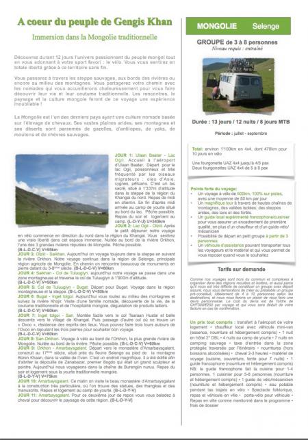 Découvrez durant 12 jours l'univers passionnant du peuple mongol tout en vous adonnant à votre sport favori : le vélo. Vous vous sentirez en totale liberté grâce à ce territoire sans fin. Vous passerez à travers les steppe sauvages, aux bords des rivières ou encore au milieu des montagnes. Vous partagerez votre chemin avec les nomades qui vous accueillerons chaleureusement pour vous faire découvrir leur vie et leur coutume traditionnelle. Les rencontres, le paysage et la culture mongole feront de ce voyage une expérience inoubliable ! Comme nos voyages sont hors du commun et complexes à organiser dans des régions reculées et isolées, et aussi parce qu'il nous est très difficile de constituer un groupe avec départ assuré, nous vous demandons de créer au préalable un groupe pré-constitué, idéalement de 4 à 8 personnes selon les destinations, et nous nous ferons un plaisir de vous faire une devis personnalisé. Le coût du devis est de l'ordre de CHF300/€300 par voyage et qui vous sera déduit de votre facture en cas de confirmation.