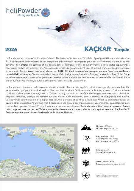 La Turquie est incontournable à nouveau dans l’offre héliski européenne et mondiale. Après 6 ans d’interruption jusqu’en 2018, l’infatigable Thierry Gasser et son équipe ont enfin été enfin récompensé pour leur persévérance, leur travail et leur patience. Les critères de sécurité et de qualité sont à nouveaux réunis et Turkey Heliski a reçu toutes les garanties nécessaires au bon déroulement de l’opération de la part du gouvernement turc, et surtout d’une concession exclusive au centre du Kaçkar. Elle est située dans le massif du Kaçkar au nord-est de la Turquie, proche de la Mer Noire. Cette proximité assure un excellent enneigement et une très bonne stabilité des pentes. Avec un domaine héli-skiable de 5 100 km2 et 400 runs répertoriés, la Turquie offre un vrai domaine «à la Canadienne». Toutes les conditions sont réunies pour proposer aux portes de l’Europe une vraie alternative à toutes celles et ceux qui ne veulent plus franchir 9 fuseaux horaires pour trouver l’eldorado de la poudre blanche. HELISKI TURQUIE